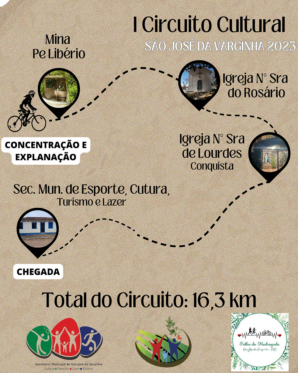 Um percurso de 16,3Km por alguns patrimônios culturais de nossa amada cidade. Uma atividade física cheia de histórias para você se encantar. As inscrições estão abertas, na Secretaria de Esporte, Cultura, Turismo e Lazer de São José da Varginha ou pelo WhatsApp da Secretaria: (37) 9 9962.1094.